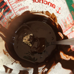 Sacar las bolitas del refrigerador y bañar con el chocolate.