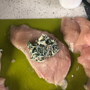 Sobre un plástico de cocina poner una pechuga de pollo, agregar una cucharada de relleno y enrollar. Poner en una fuente para horno y cubrir con 2 laminas de tocino que queden lo más ajustadas posible para que no permitan que el rollo se abra.