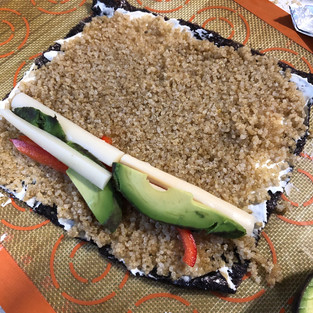 Sobre una hoja de nori, poner queso philadelphia (la receta original va sin, pero yo le agregue por el sabor y por que el montaje es mucho más fácil, quedan más armados).